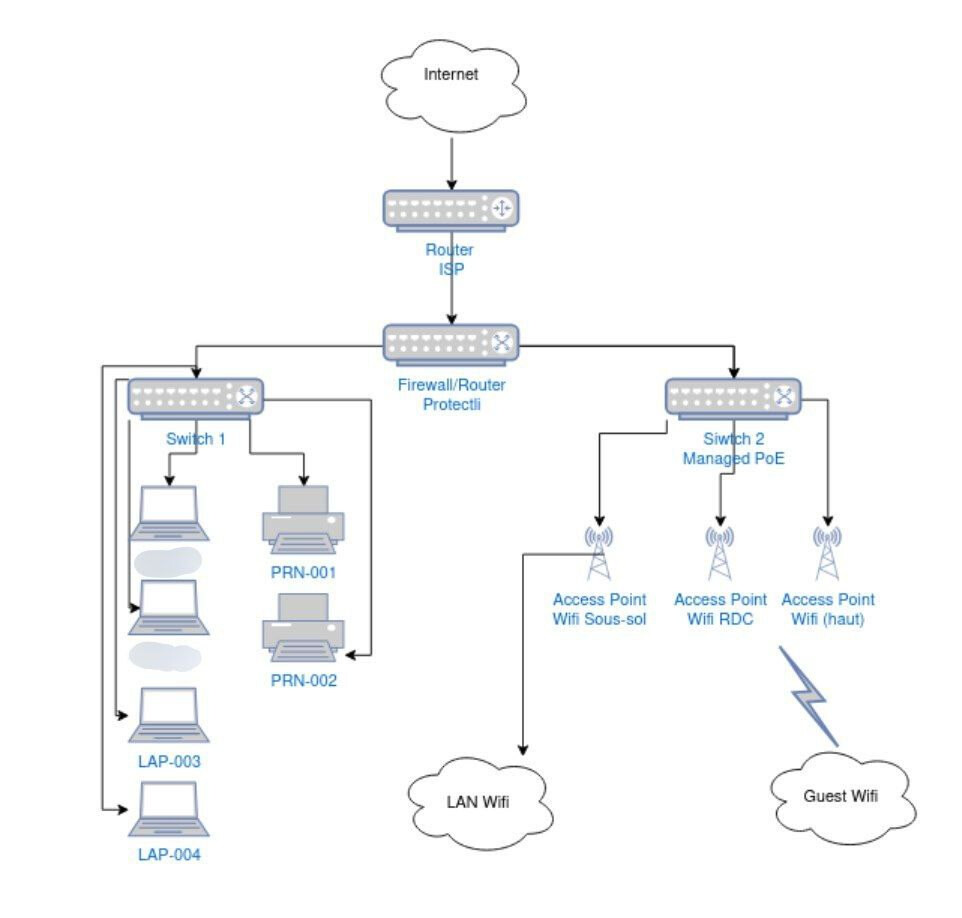 Voici un schéma réseau (avec quelques erreurs), pour une maison de 3 étages (un contrat récent).